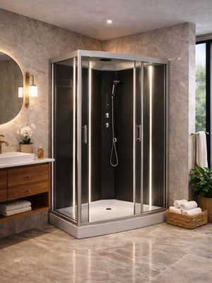 The Glasstra Shower Enclosure by Cesmar Italian is a premium luxury shower cabin designed for modern bathrooms seeking elegance, performance, and durability. Crafted with a sleek grey low-profile 15 cm tray, transparent 5 mm toughened glass, a painted grey back wall, and a refined grey glass central panel, Glasstra delivers a contemporary spa-like shower experience. Featuring black aluminium profiles, smooth adjustable rollers, black handles, a tropic rain shower, 6 hydromassage jets, integrated lighting, ventilation fan, control panel, radio, and a glass shelf, this designer shower enclosure combines advanced functionality with Italian-inspired aesthetics. Ideal for high-end residential bathrooms and luxury interior projects, the Glasstra shower enclosure is a perfect choice for modern shower cabins, premium bathroom solutions, and stylish wellness spaces.