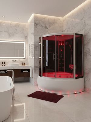 This luxury grey steam shower enclosure is designed to deliver a premium spa experience with modern aesthetics and advanced functionality. Crafted with a 15 cm low grey tray, transparent 5 mm front glass, and a painted grey 4 mm back wall, it offers durability, safety, and elegant minimalism. The grey glass roof, black aluminum profiles, and sleek black handles enhance its contemporary appeal, while 6 hydromassage jets, a tropic top shower, and an integrated control panel ensure total relaxation. Featuring LED lighting, built-in radio, ventilation fan, and adjustable rollers, this modern steam shower cabin is ideal for luxury bathrooms, wellness spaces, and premium residential projects, available in 1200×1200 mm and 1500×1500 mm sizes for versatile installation.